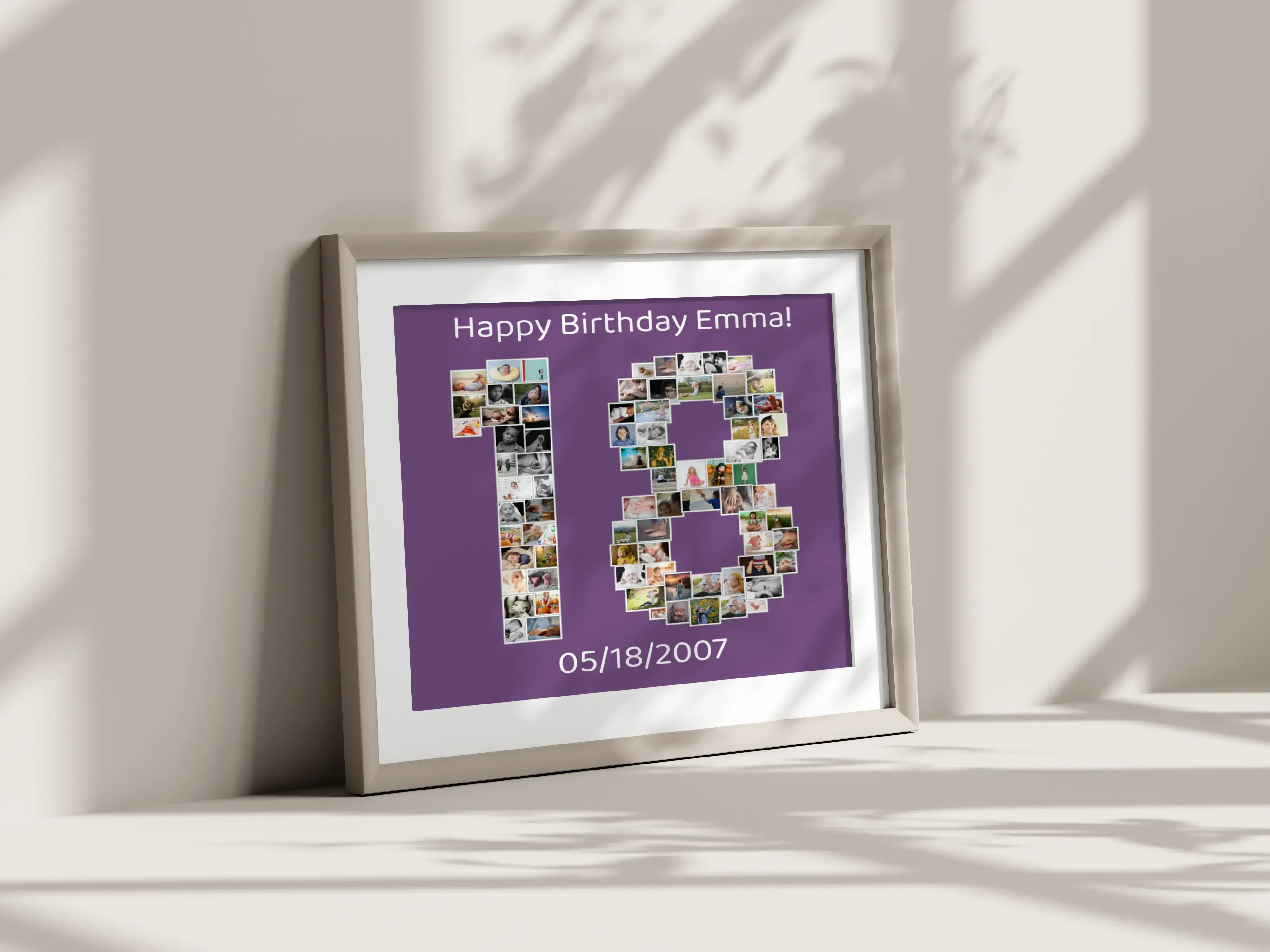 Create your personalized photo collage today and make memorable moments last forever with our beautifully crafted number "18" design. Perfect for celebrating milestones like birthdays or coming of age, you can compile 1 to 100 photos to form the number. Choose from various templates to reflect your unique story and gifting purpose.
