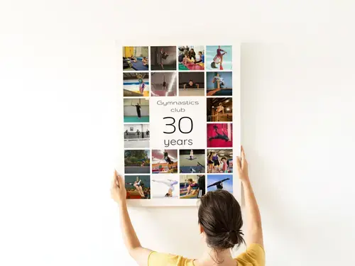 Here’s how it works: pick the number template, switch 30 to any number or year, add a name and greeting, upload your photos, then auto-fill or drag them into place. Crop, reorder, fine-tune spacing and colors, preview live, and when it’s perfect, choose size and material, add to cart, or get a download.