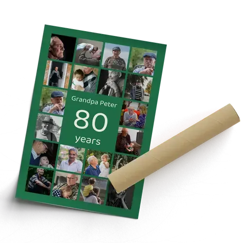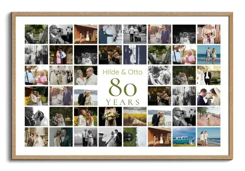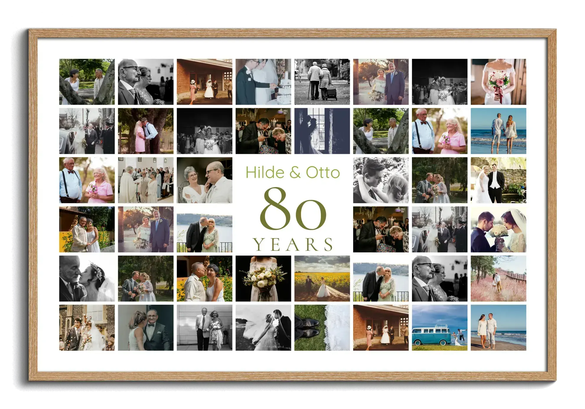 Create yours now. Mark 80 years with a Jubilee Number Collage: a big 80 in the center, a name above, a personal greeting below, framed by 20–80 photos in a clean grid. Customize number, name, message, image count, background, colors, and orientation. Perfect for an 80th birthday, 80 years married, or an 80-year company jubilee.