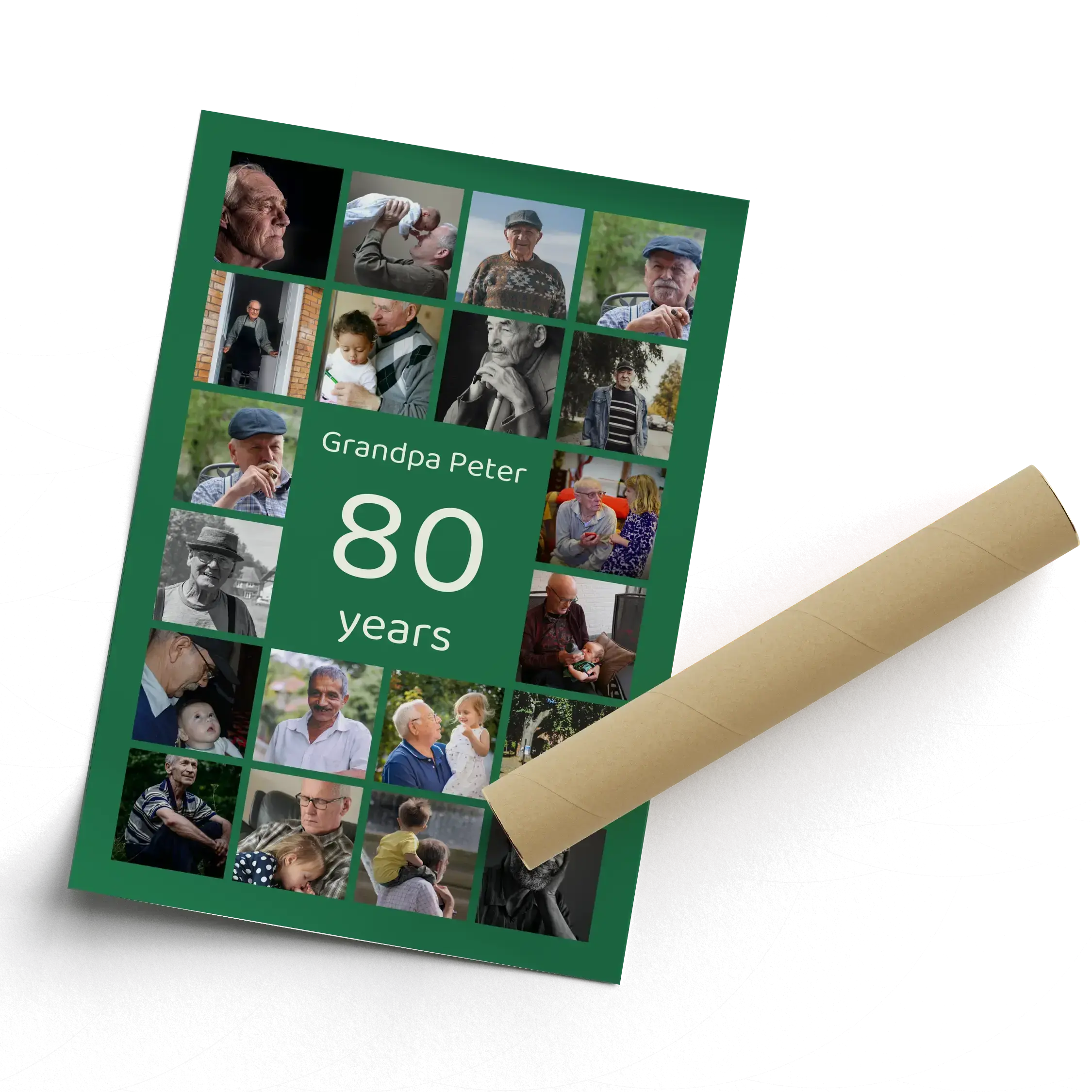 Here’s how it works: pick the 80 design, swap the number if you need, add name and greeting, upload your photos, then drag, crop, and fine-tune every detail in the live preview. When you’re happy, finish and order in your favorite format or grab a high‑res download.