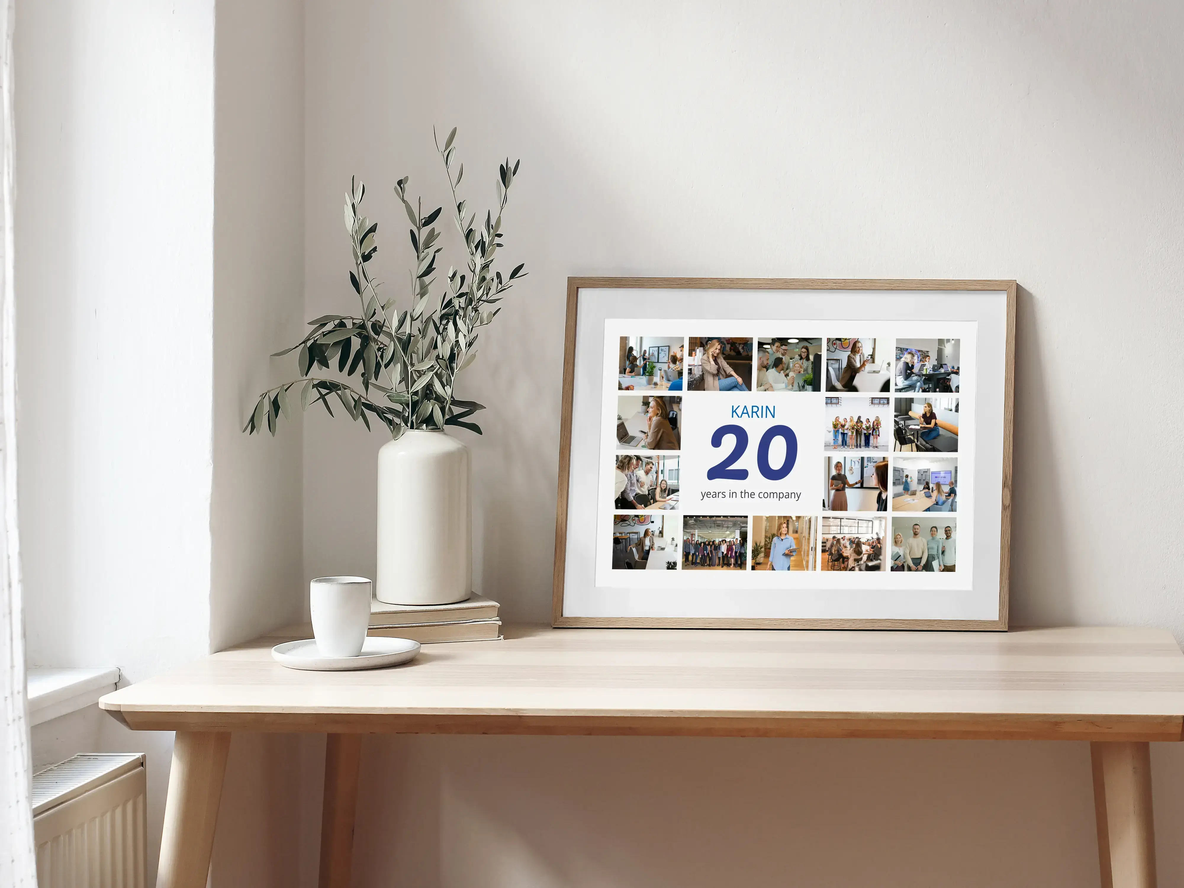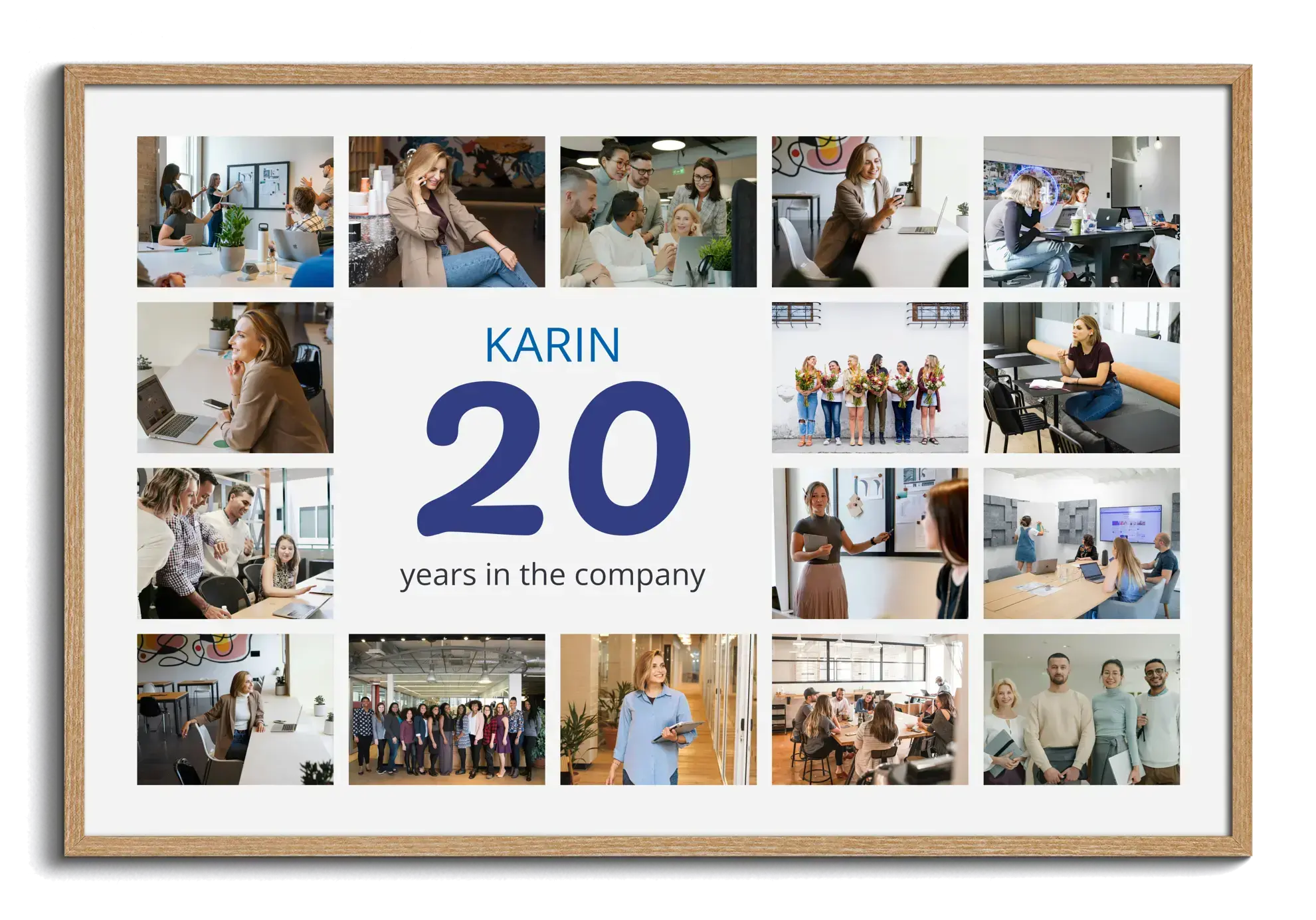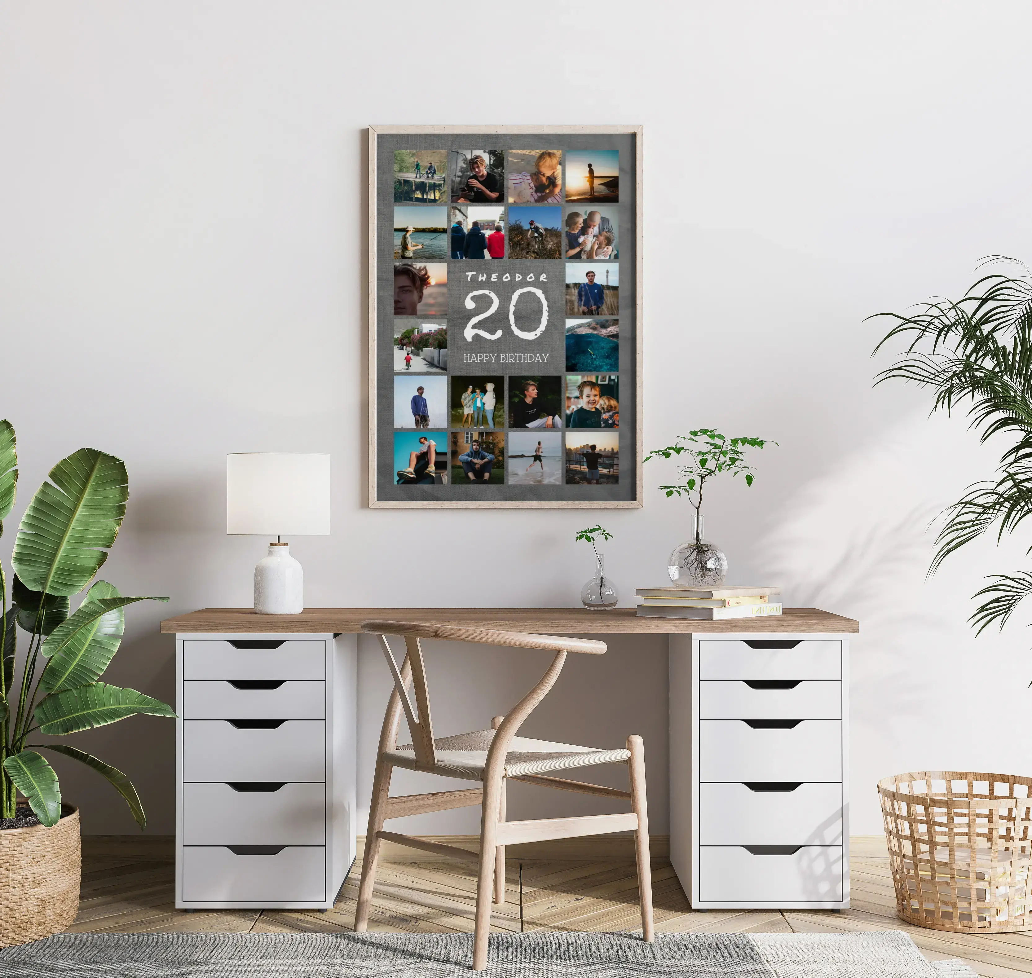 Get started now. This example shows a bold 20 centered on the print, a name placed above, and a short greeting below, all surrounded by 20–80 photos arranged in a tidy grid. Change the number, swap in your images, edit name and message, pick background and colors, and choose portrait or landscape. Perfect for 20 years of friendship, a 20th birthday, or 20 years at the company.