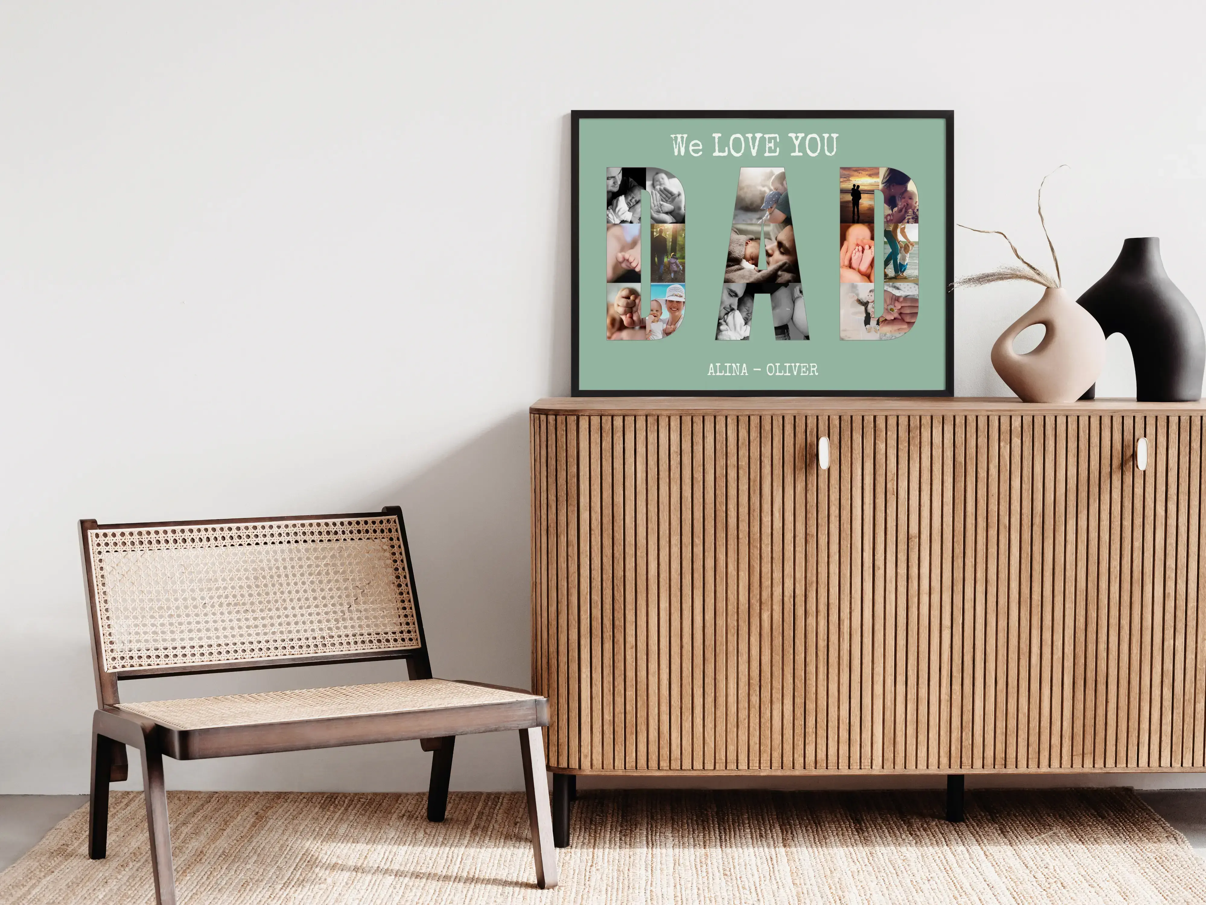 Create a heartwarming gift for a special dad with our customizable photo collage reading "We LOVE YOU DAD". This collage forms the word "DAD" out of cherished photos and is surrounded by a heartfelt message above and the children's names below, making it an ideal gift for Father's Day or just to show appreciation. Personalize all text and names to fit your family perfectly.