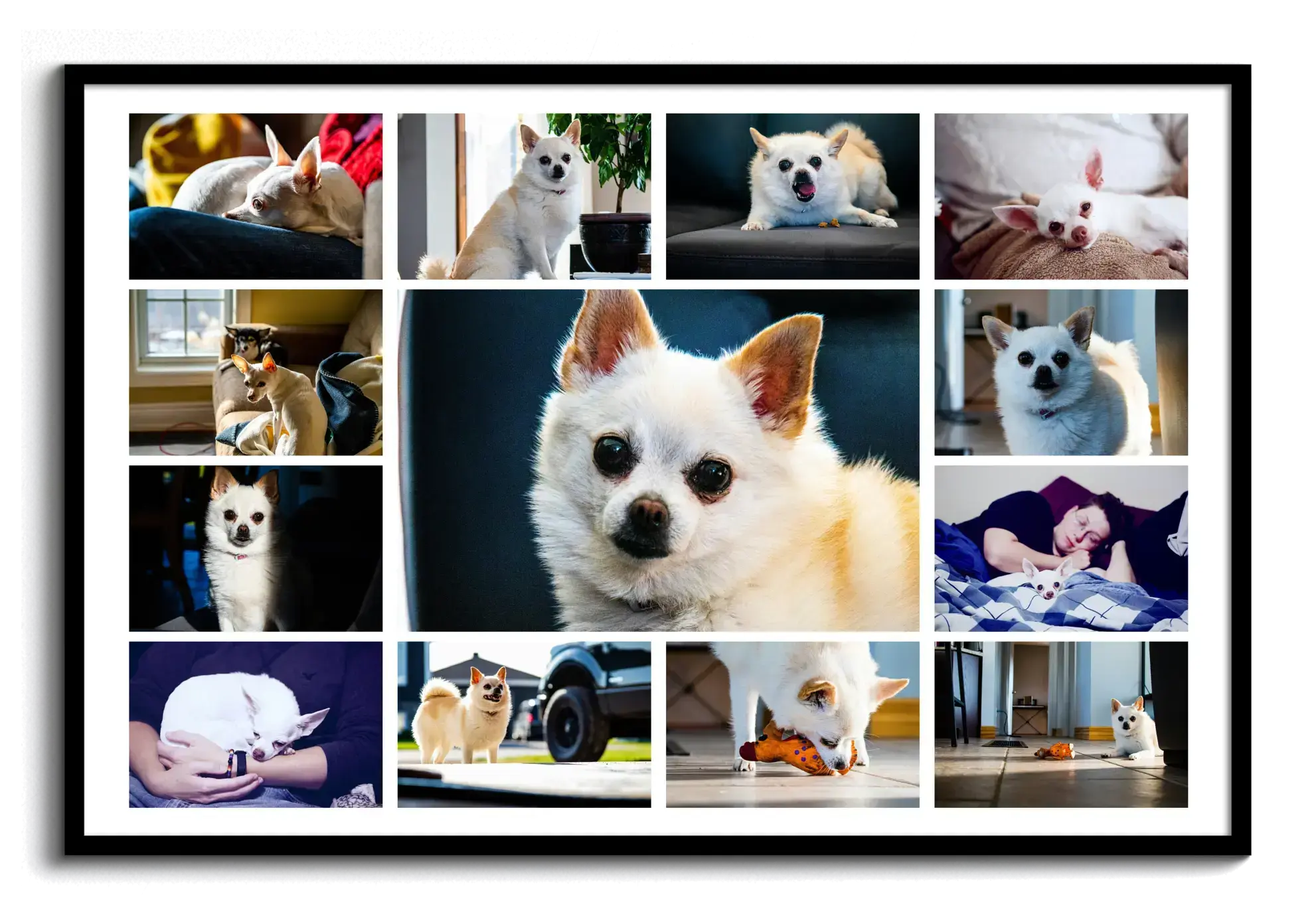 Create your own personalized dog lover's photo collage and capture the special moments with your furry friend. Featuring several individual photos of your dog, with a large central image, this collage is perfect for cherishing memories or gifting to fellow pet owners. Customize the photos and layout to your liking.