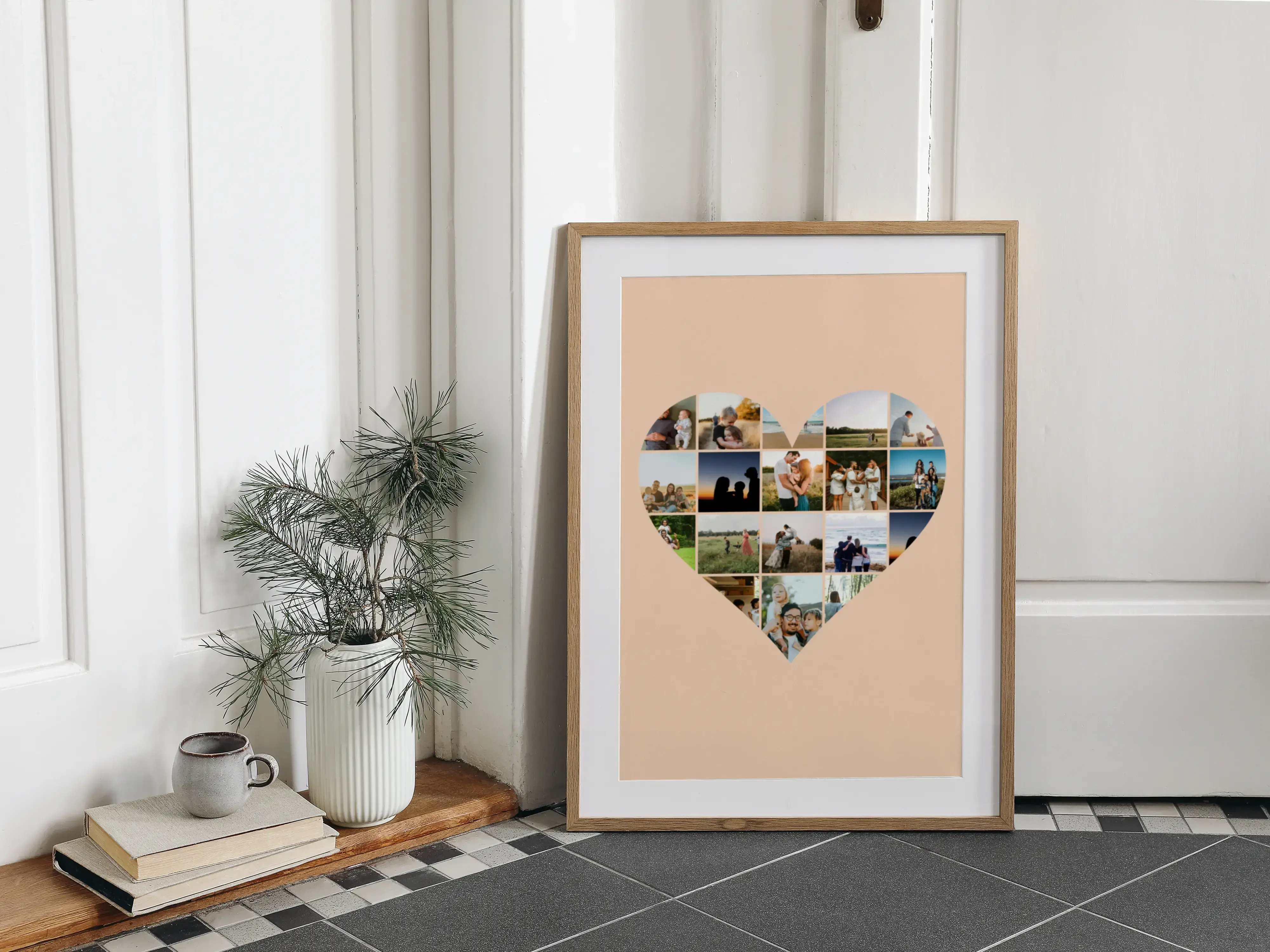 Design it your way: adjust spacing, margins, and background colors or textures, switch between grid, heart, or text shapes, use Polaroid-style frames with captions, fine-tune crops per image, apply subtle filters, and set fonts, sizes, and alignment. Add as many photos as your chosen layout supports.