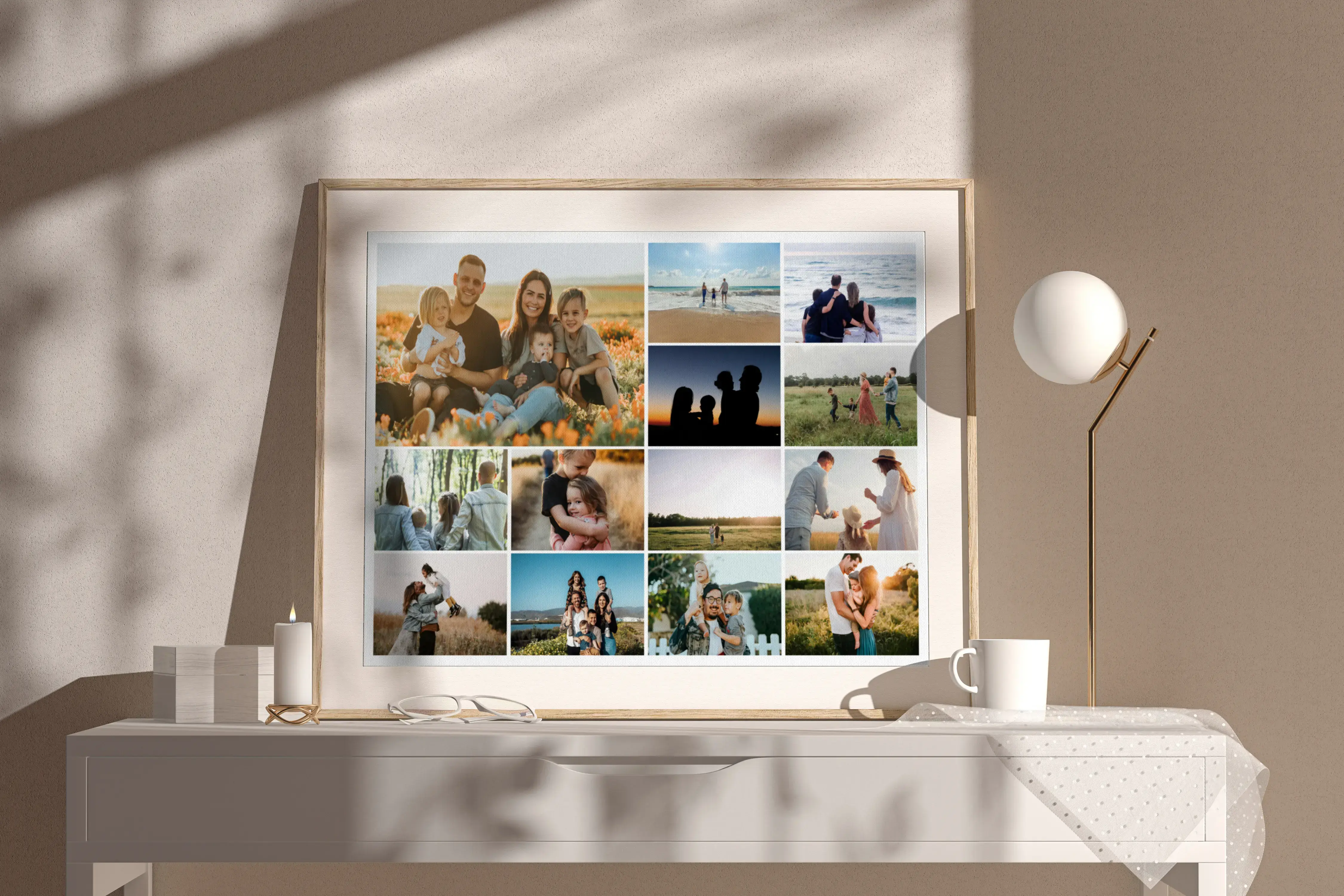 Create yours now: turn favorite family moments into a ready-to-order art print. Drop in photos of your family using clean grids, playful hearts, or bold text layouts, then add a line like Family Happiness or The Parkers 2025. Choose a size and finish that matches your space. Perfect for living rooms, nurseries, or a gallery wall.