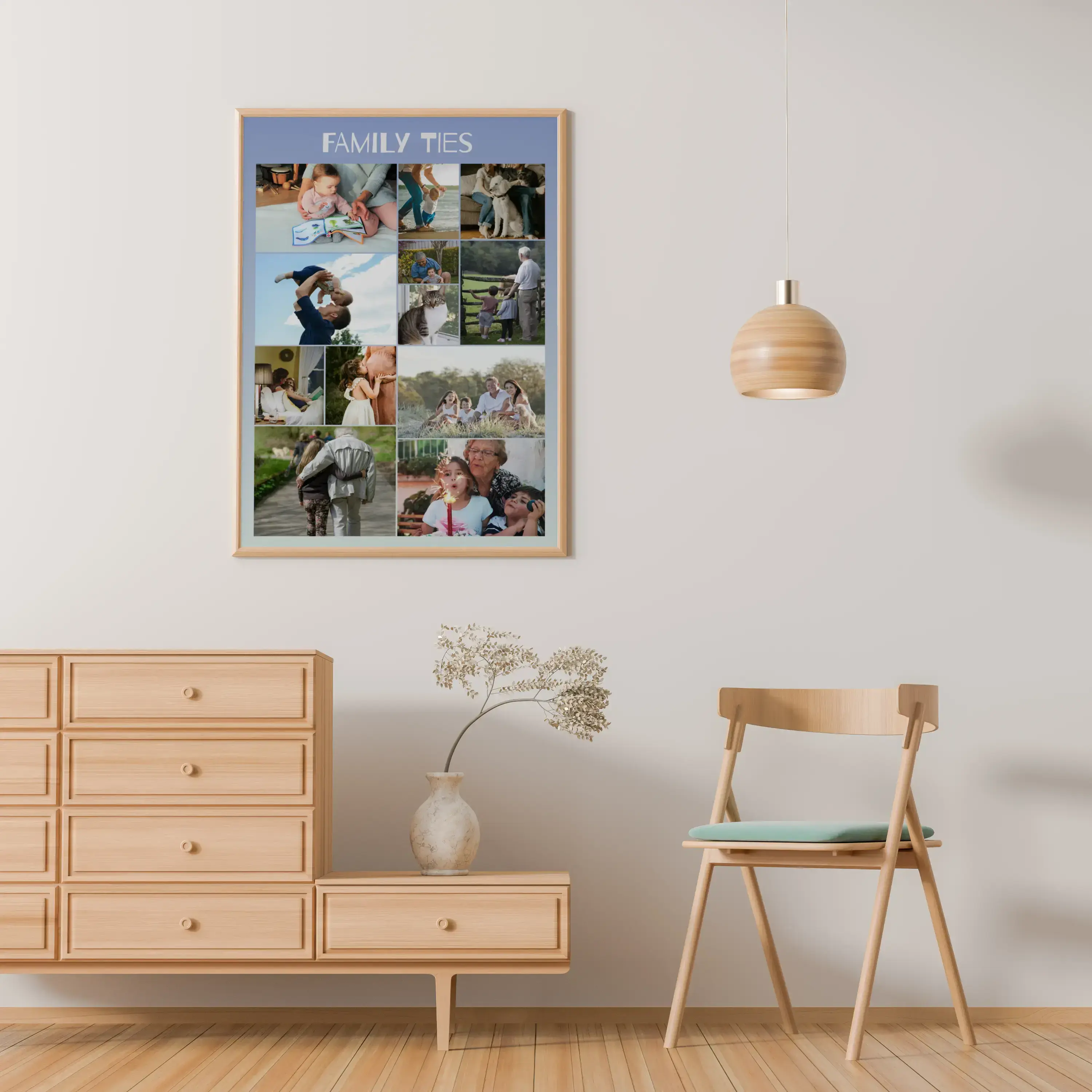 Create your own personalized photo collage featuring your whole family! With our flexible Wild arrangement, you can use between 3 to 200 photos placed in a fun, random layout. Customize the title above the images to say "Family Bonds" or anything else meaningful to you. Ideal as a heartfelt gift or a beautiful addition to your home decor, personalize every aspect including texts and quirky quotes. Select your favorite colors to match your style.