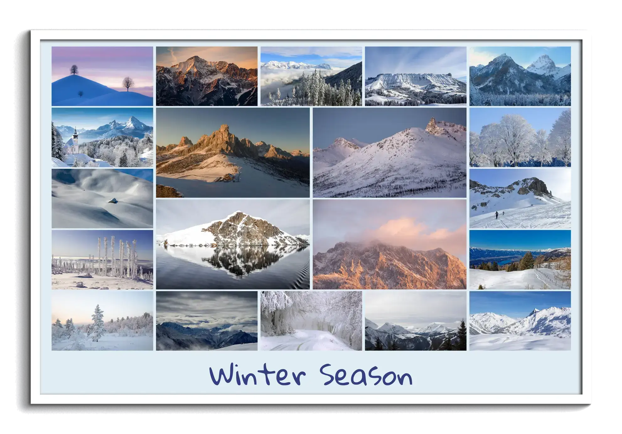 Create your custom landscape collage now. Celebrate forests across spring, summer, fall, and winter, winding roads glowing with fall color, blooming summer meadows, towering mountains with snow-dusted peaks, and serene wintertime moments—arranged in premium templates and printed with rich, gallery-quality detail.