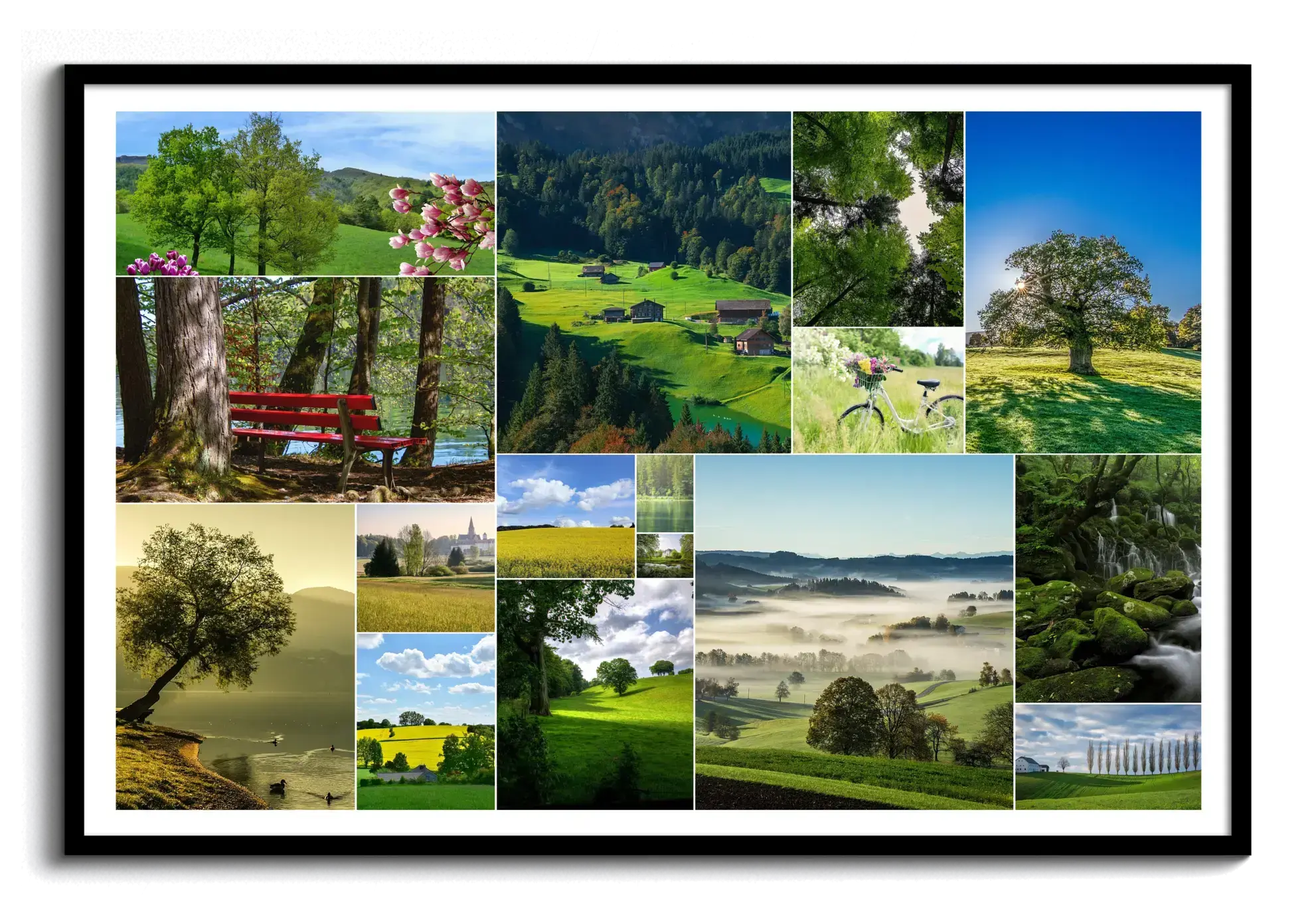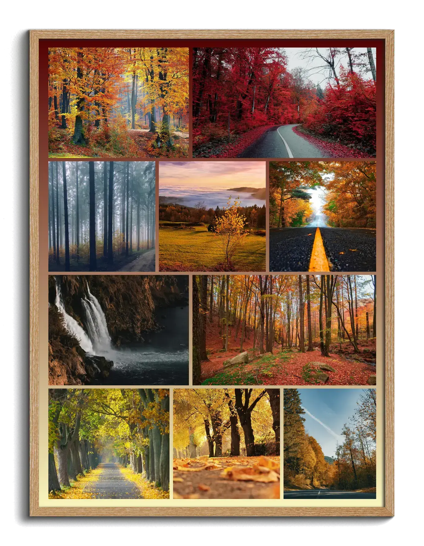 Seasonal landscapes—forests, meadows, roads, snowy peaks—shine in premium collage prints.