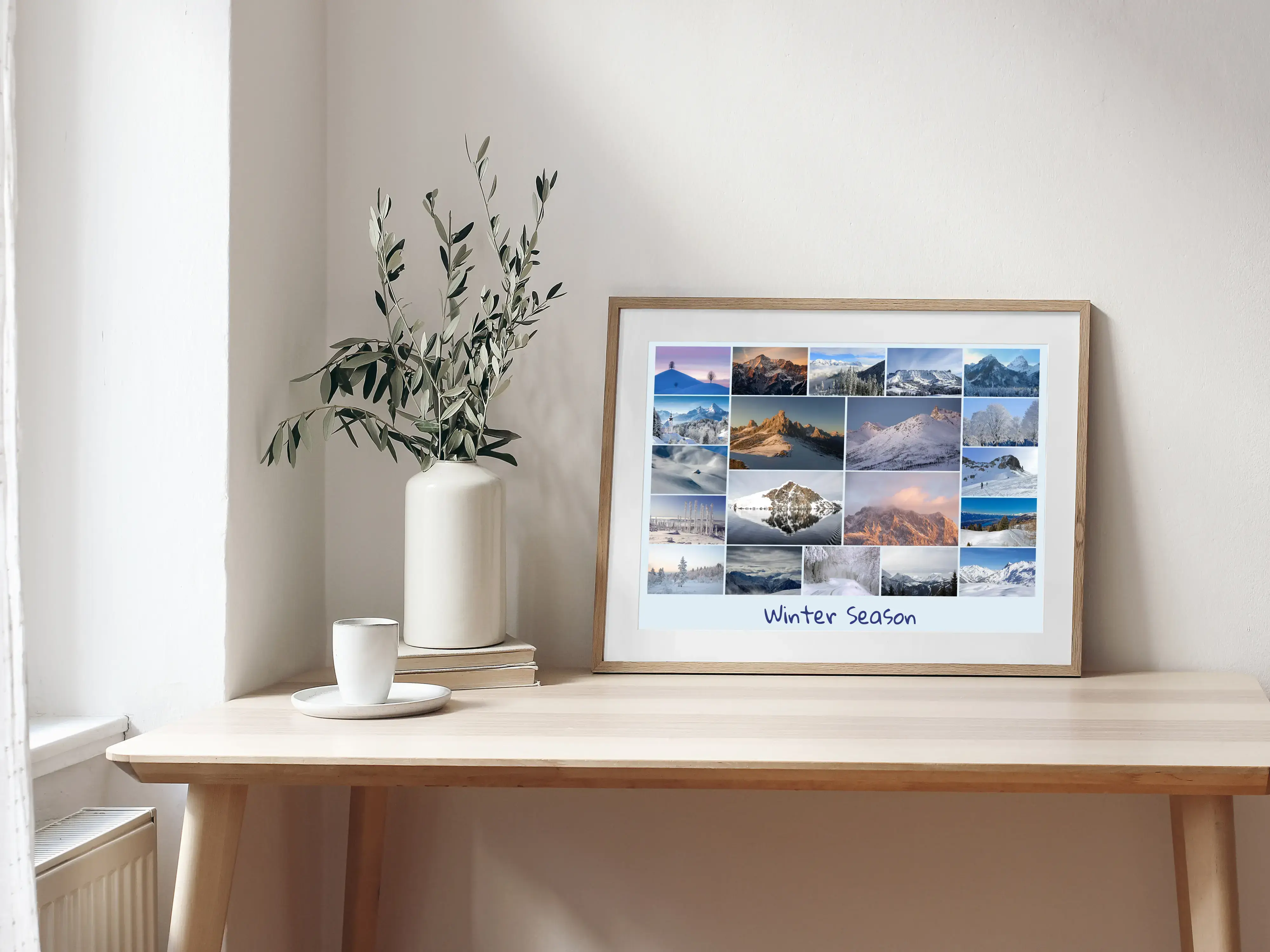 Seasonal landscapes—forests, meadows, roads, snowy peaks—shine in premium collage prints.