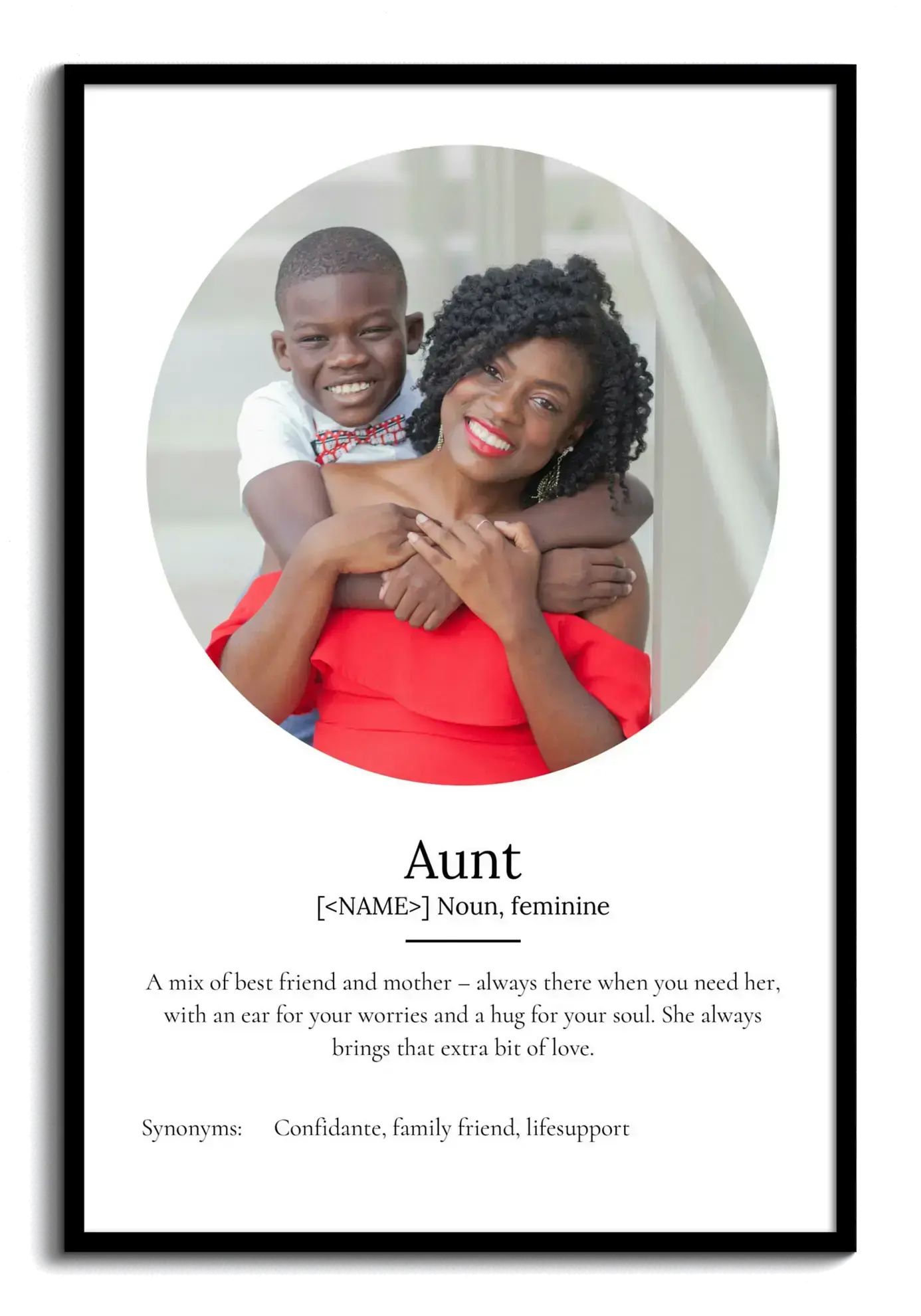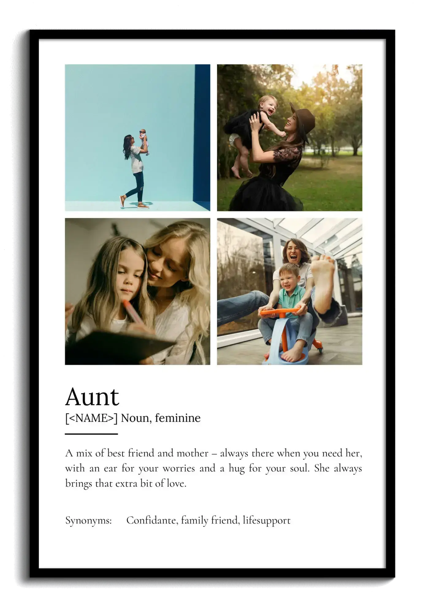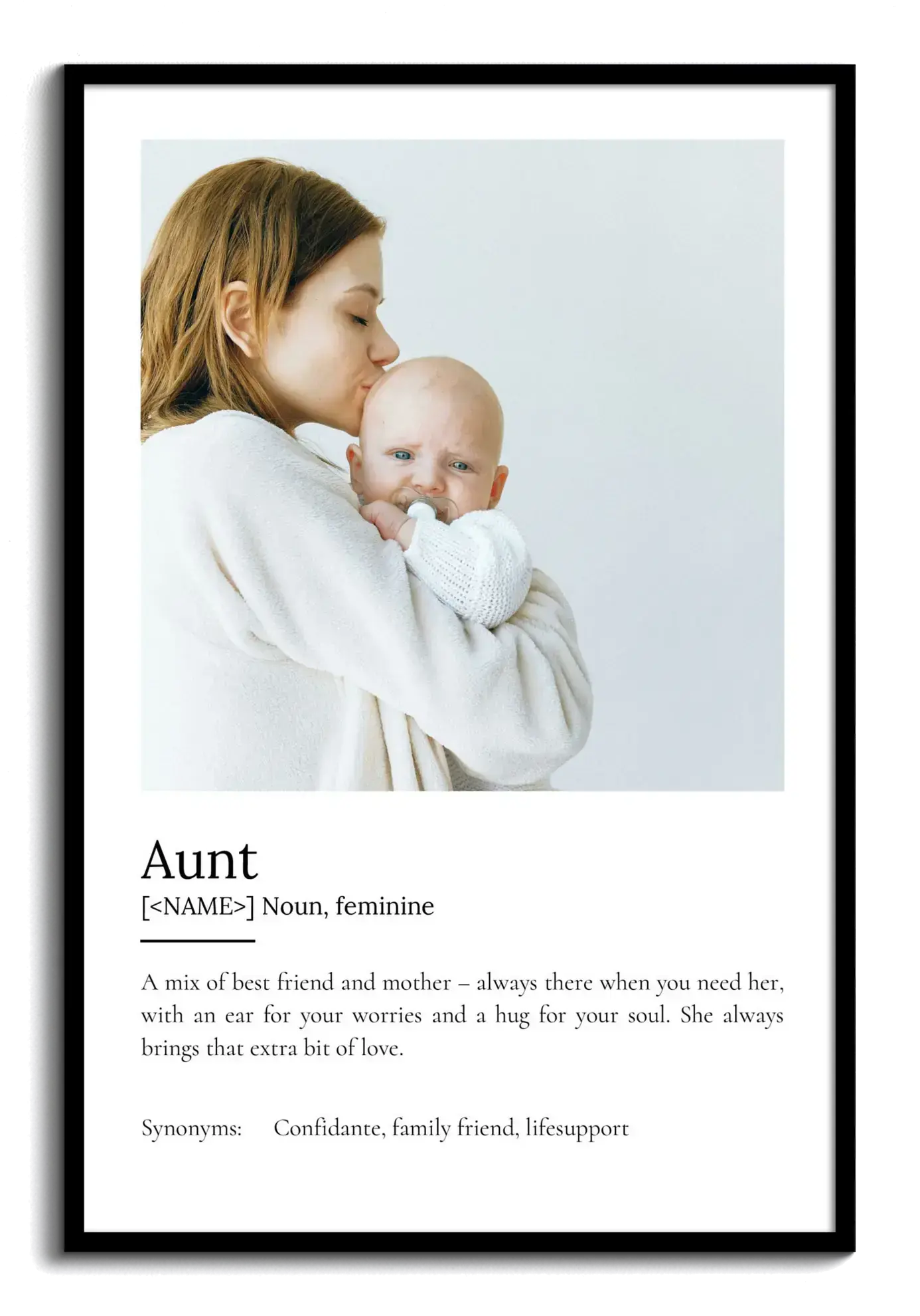 Create a heartfelt gift that your aunt will cherish forever with our customizable Definitions Poster Aunt in Duden style. It's the perfect blend of a personal photo, or up to 9 photos, and a unique definition. Capture her essence with the text: A mixture of best friend and mother – always there when you need her, with an ear for your worries and a hug for your soul.