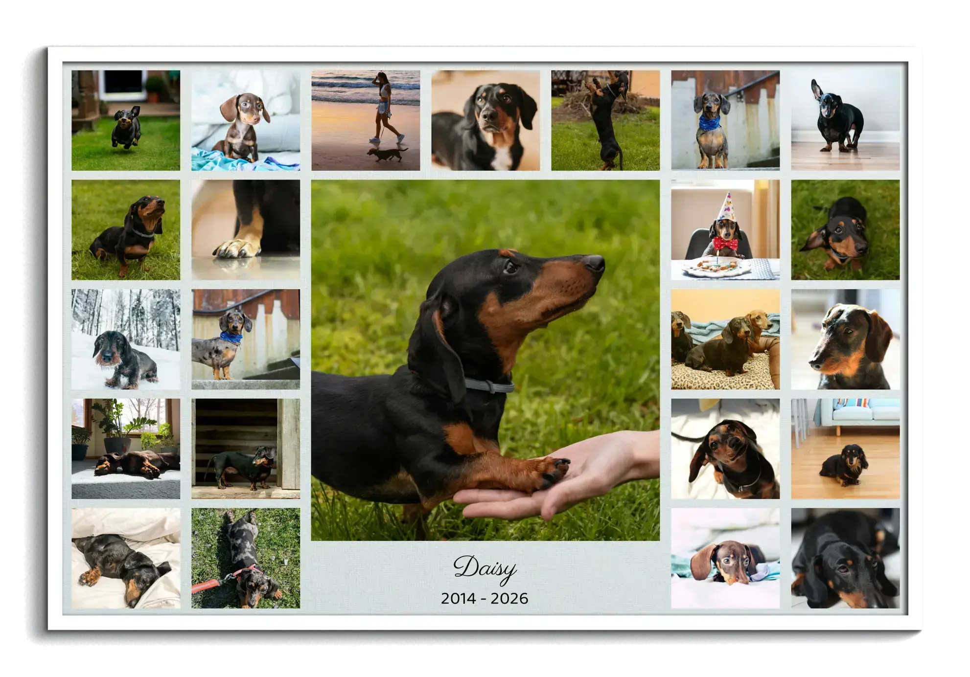 Dog silhouette collage filled with photos to honor a beloved pet, with customizable name and years.