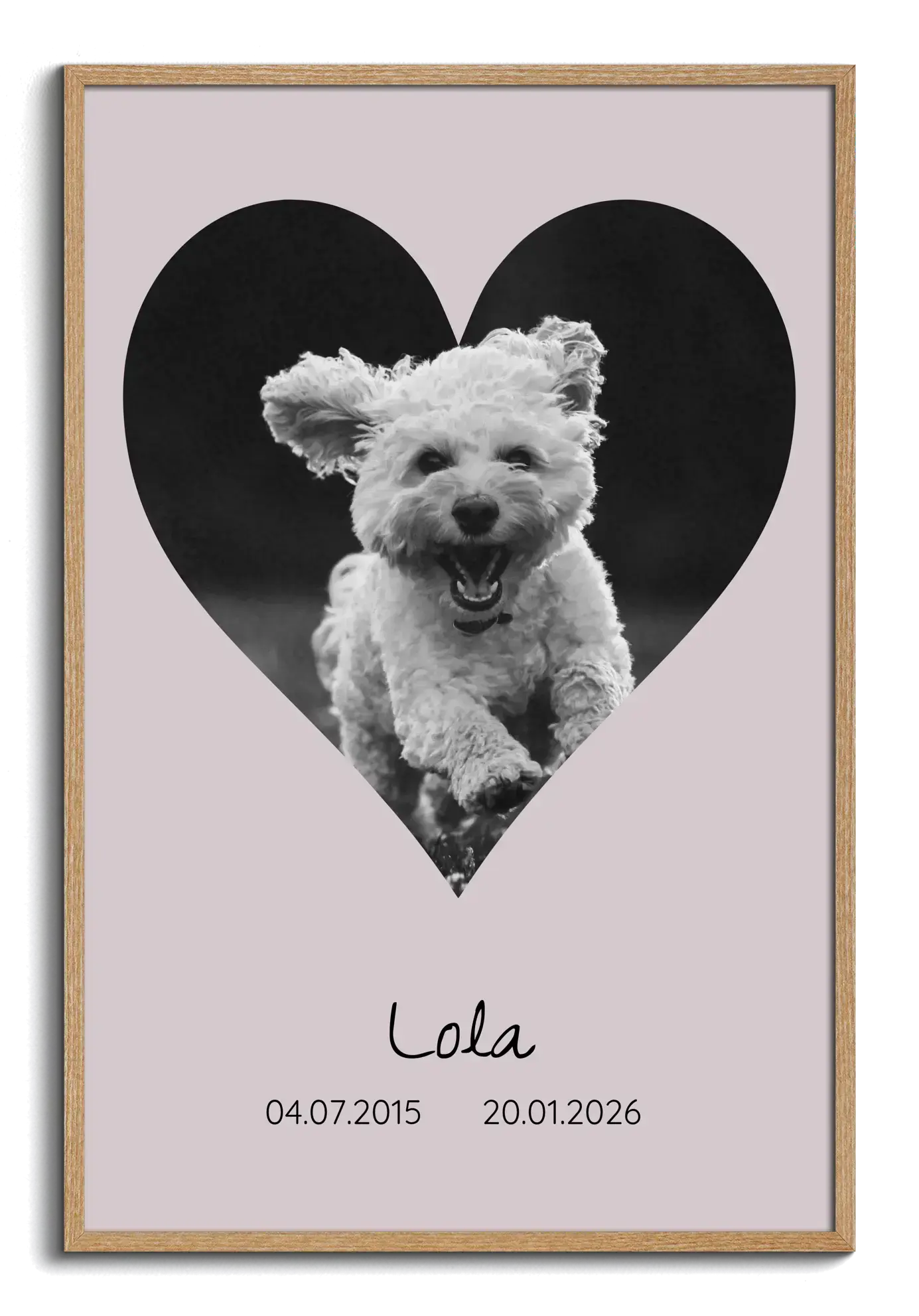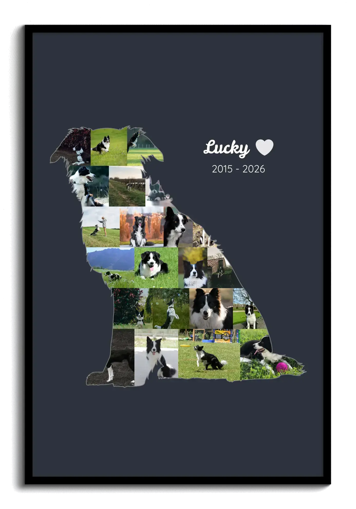 Start your custom print now. This example is a dog-shaped memorial print: a clean silhouette filled with many small photos on a dark backdrop, with the name and life years set alongside. It’s based on our Pet – Memorial (Silhouette) template and can be tailored with your pictures, name, dates, and an optional tribute line.