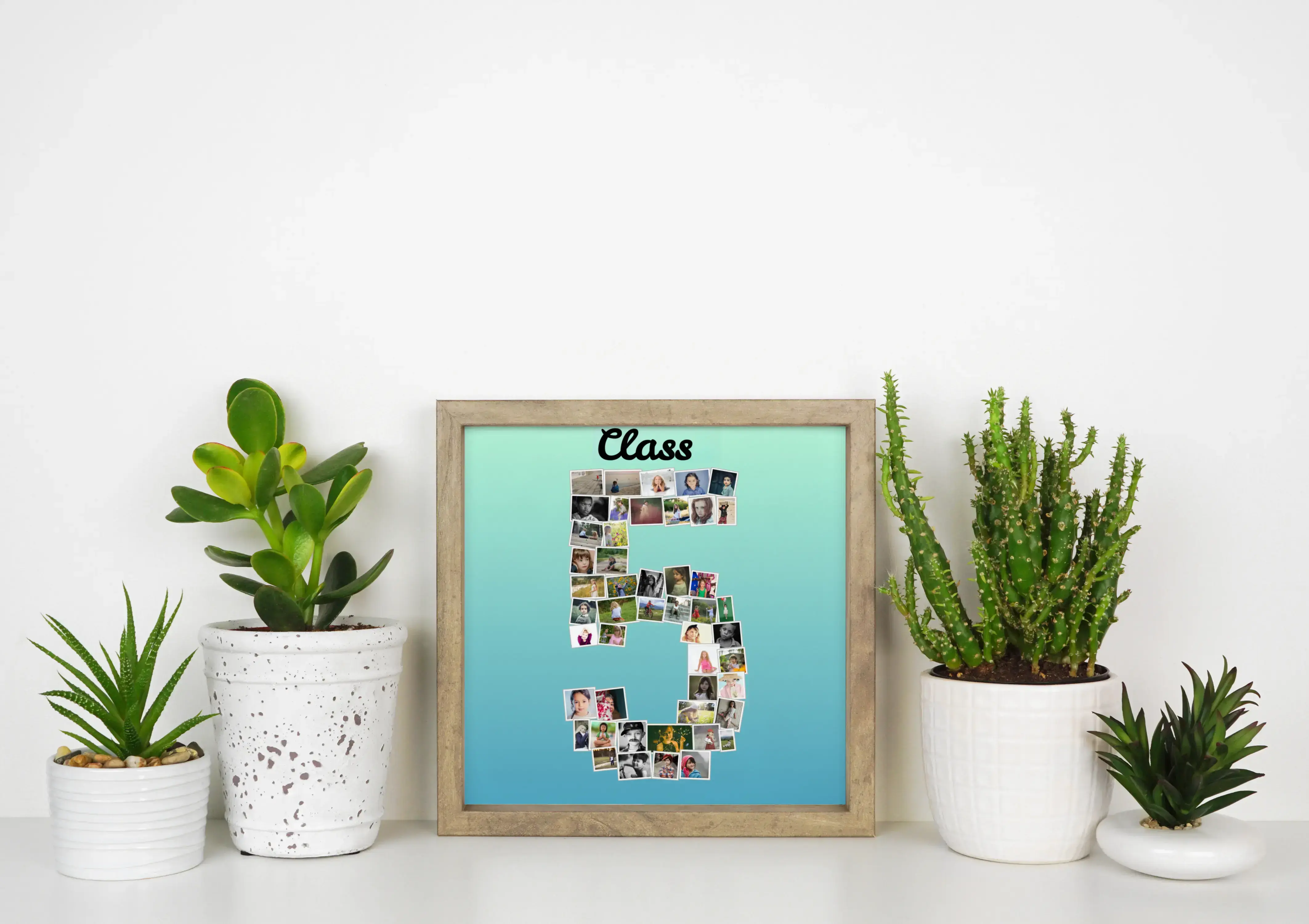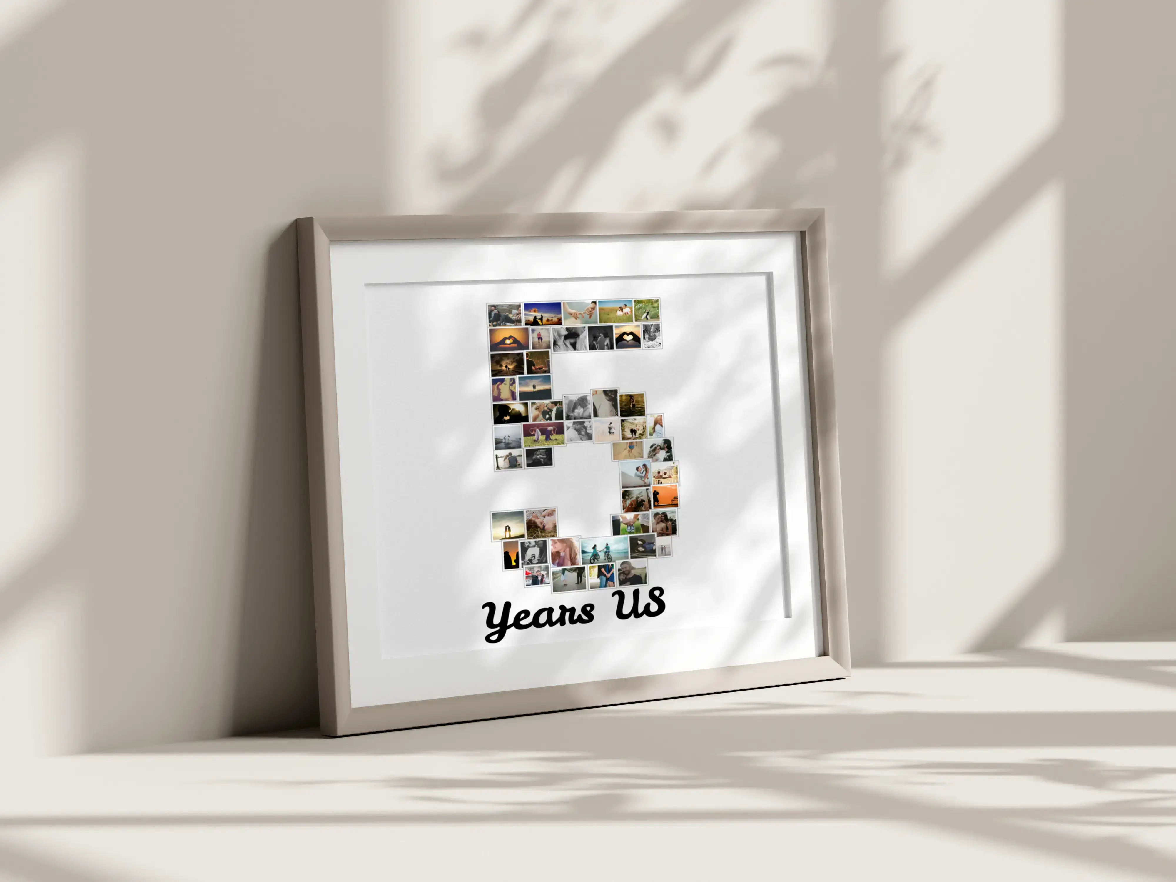 Create your own stunning photo collage and bring your cherished moments to life with ease. Imagine crafting a collage in the shape of the number '5', composed of up to 100 photos. Whether it's for celebrating a work anniversary, an enduring relationship, a wedding, or a child's birthday, this personalized product makes it memorable.