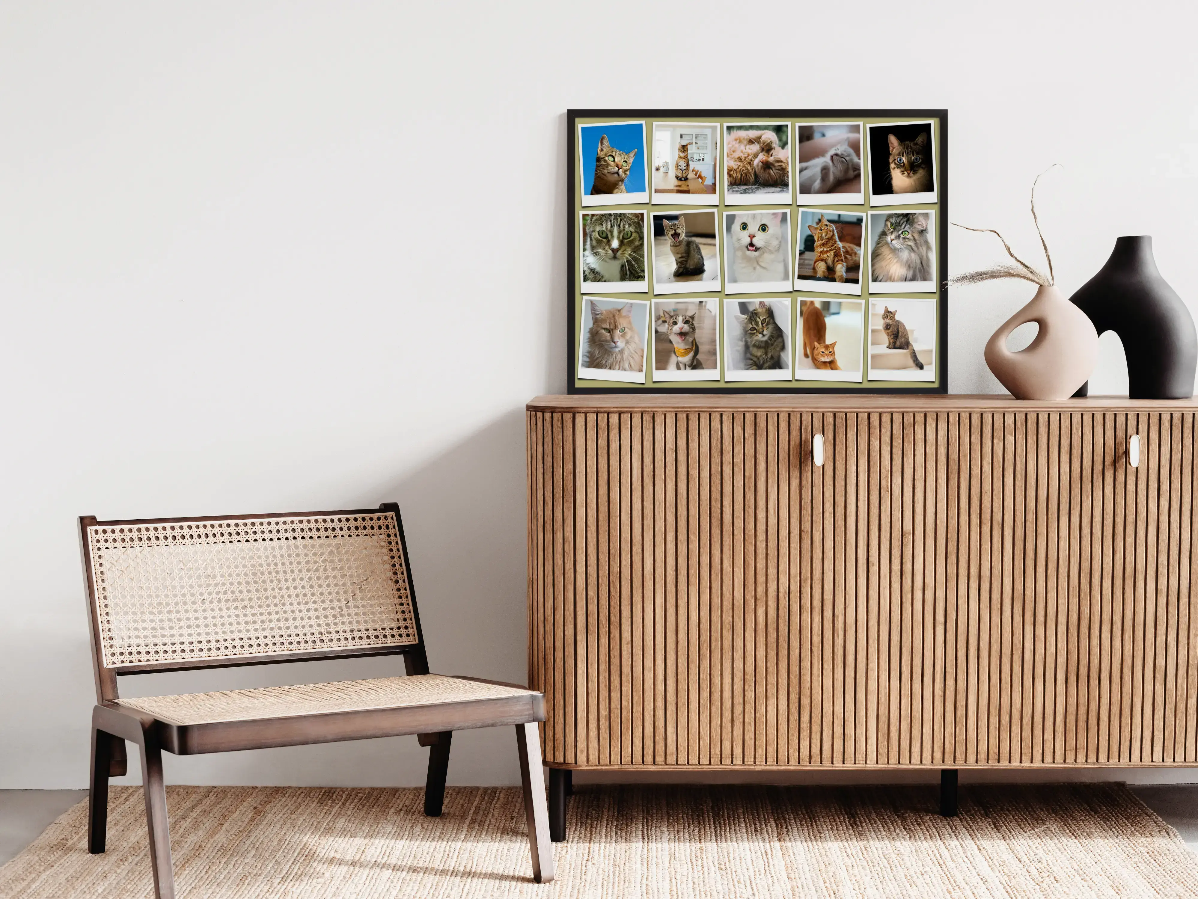 Polaroid-style collage template for cat photos, with custom names like Floris the cat.