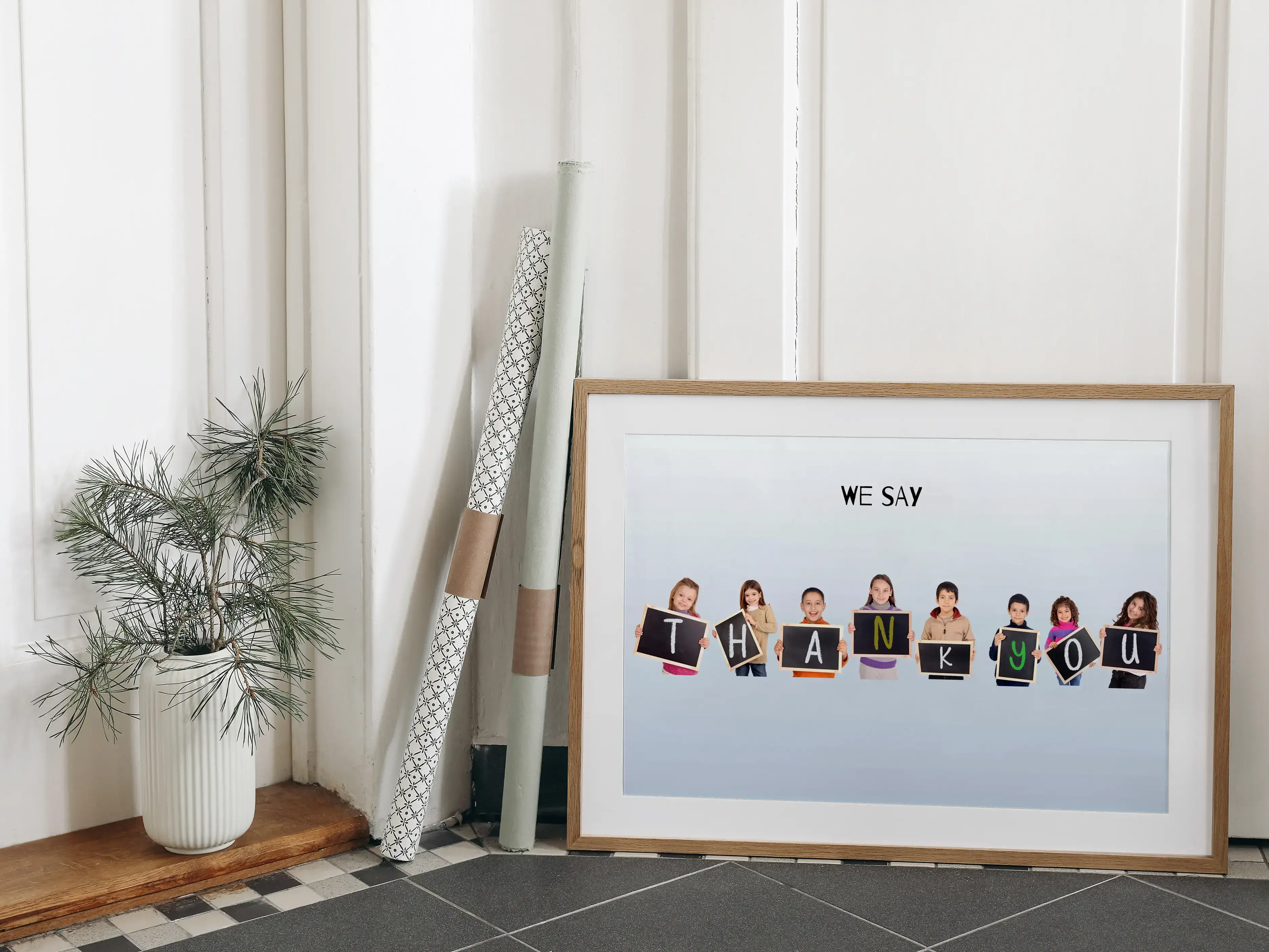 Create something truly special and say "Thank You" in a unique way with our customizable photo collage. Imagine a group of schoolchildren holding up letter boards to spell out "THANKS," accompanied by the heartfelt phrase "We say Thank You." It's the perfect gift for teachers, a charming display in classrooms, or a memorable keepsake for parents. Every aspect, from photos, colors, font, to the saying and layout, is yours to personalize.