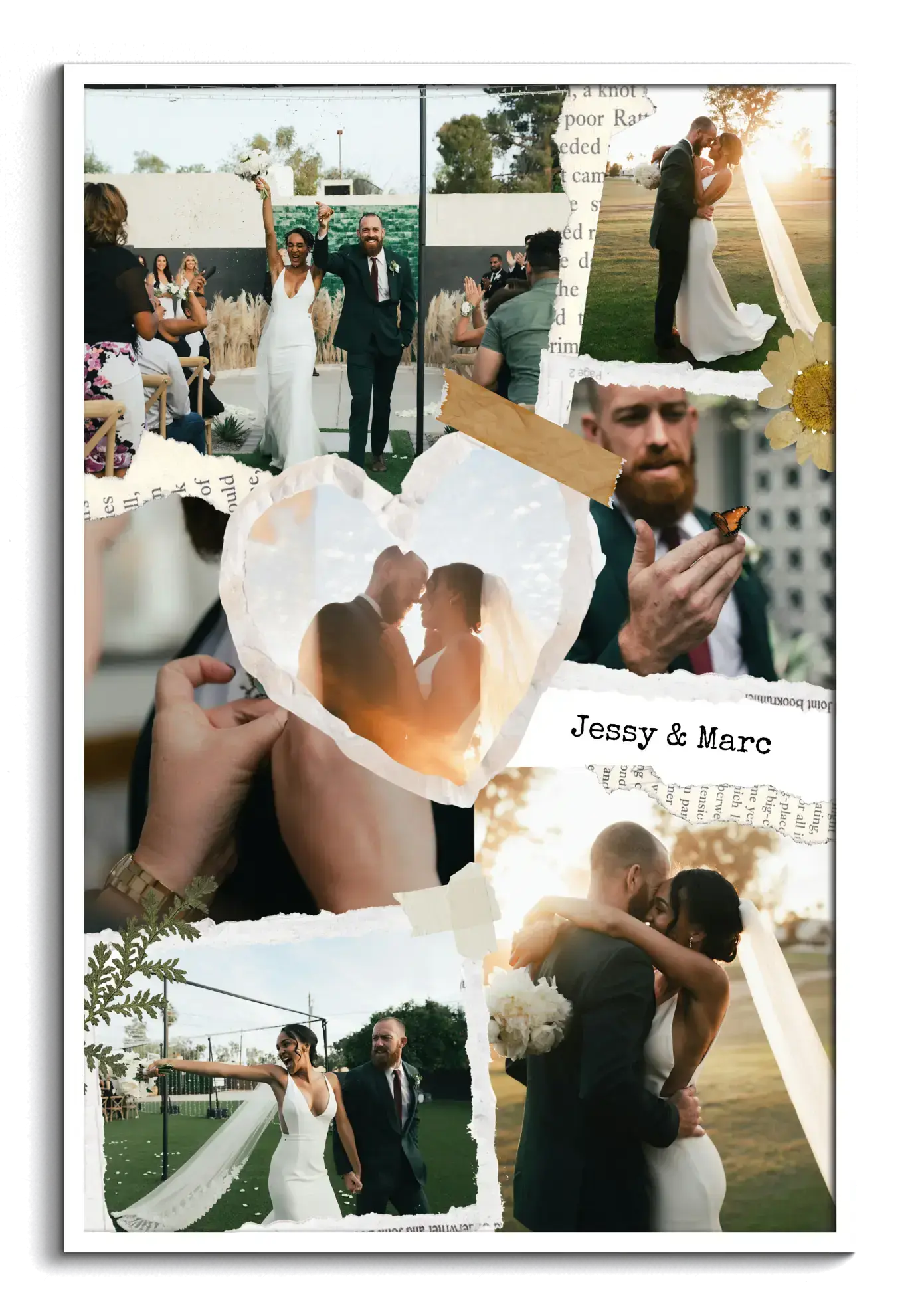 A wedding scrapbook collage with taped photo cutouts, handwritten details, and heartfelt charm.