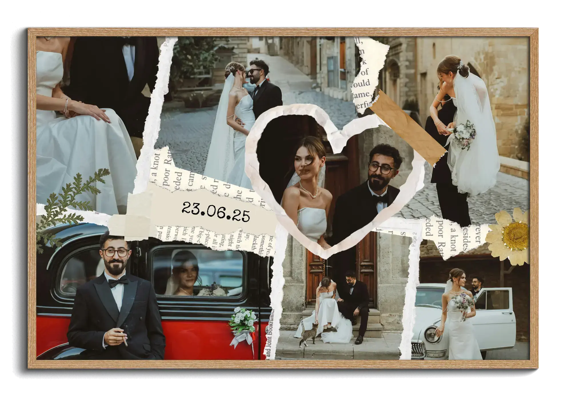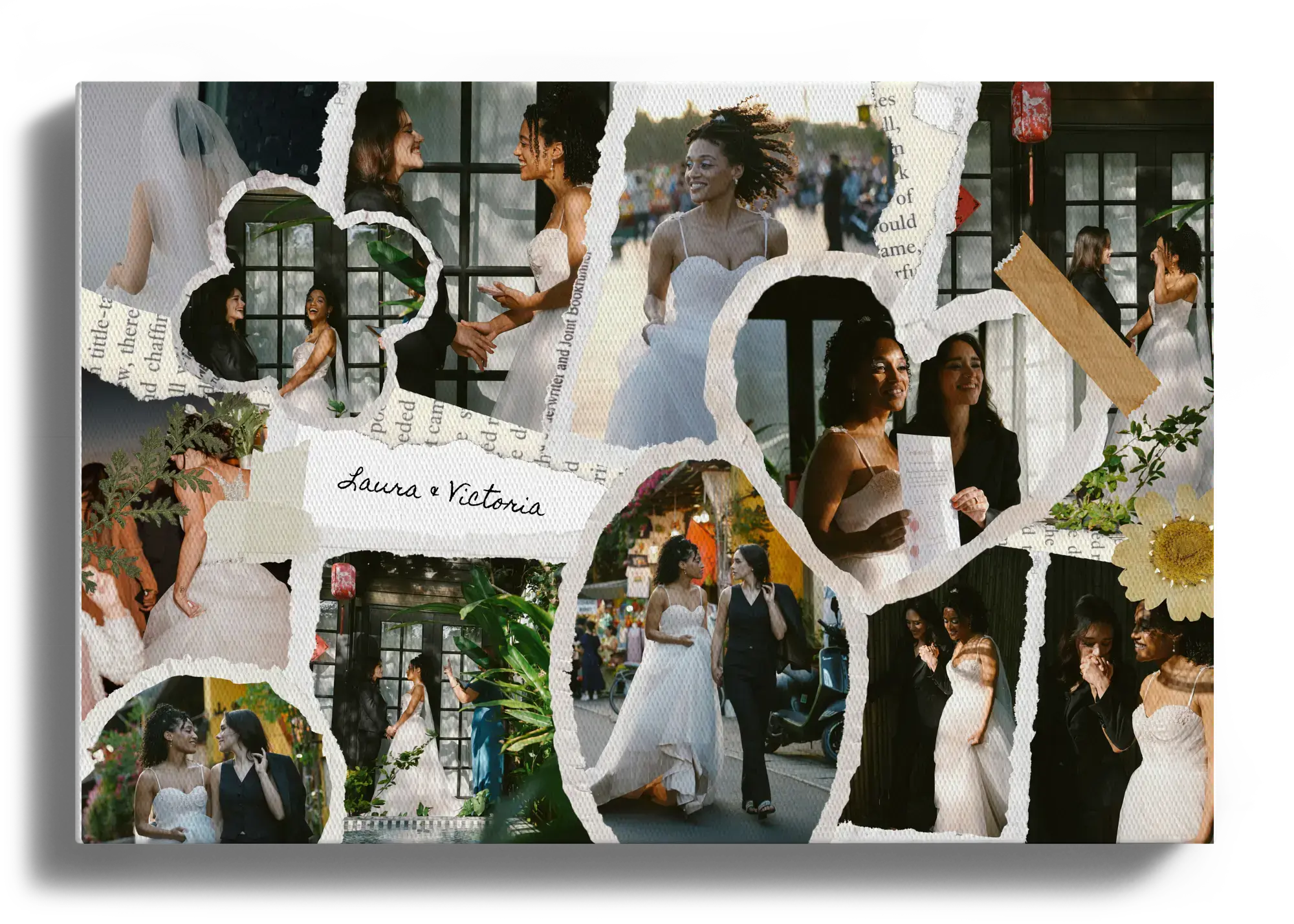 Create your wedding scrapbook print now and turn your favorite moments into a keepsake full of character. This scrapbook-style layout brings together multiple photos like cut-out paper pieces, with tape details and handwritten text such as names and a date. Perfect for weddings, engagements, and lasting memories in portrait or landscape format.
